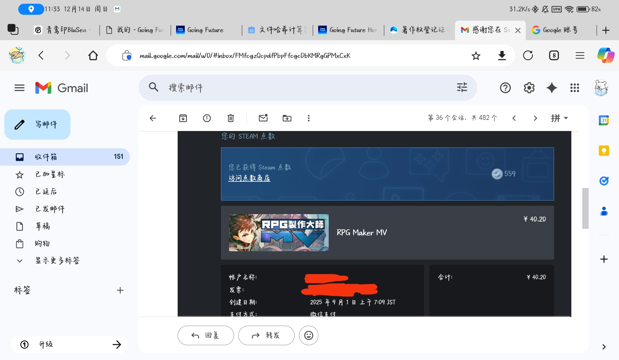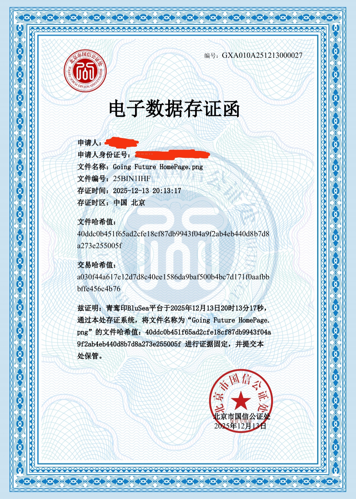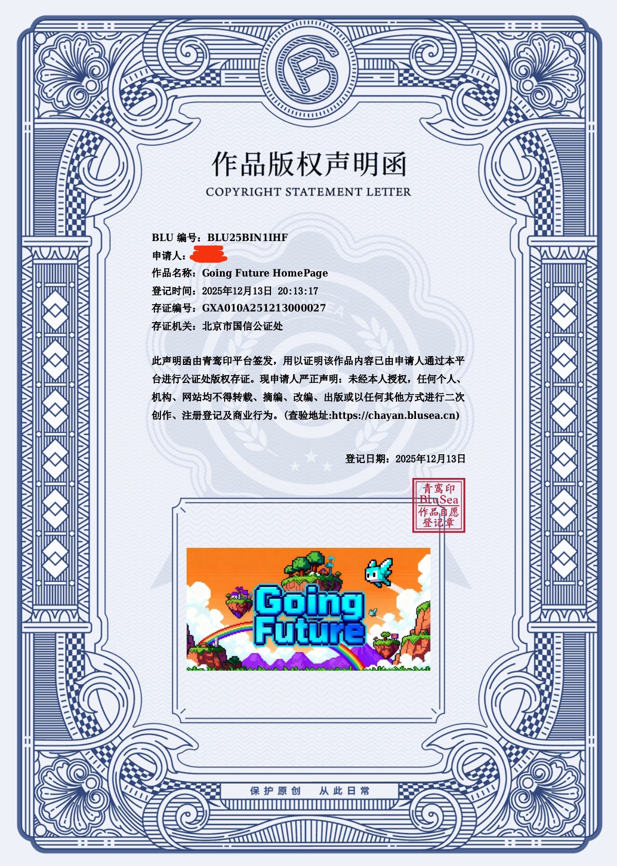 我们十分重视Going Future的版权保护,其制作工具均属正版,我们会对游戏本体及部分CG绘画(指的是我们自己所绘制的CG,对于其他作者所绘制的CG我们不做版权保护,您可以在鸣谢页面找到他们)进行存证保护,所以请各位玩家遵守法律,禁止倒卖,贩卖,对我们的CG作品进行商用,违者必究如您发现以上行为,可以通过工单举报RPG Maker MV Steam 购买记录HomePage版权存证书